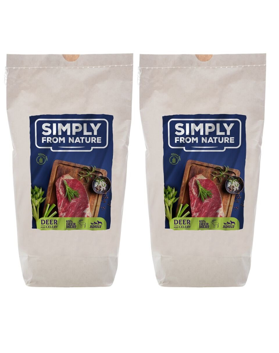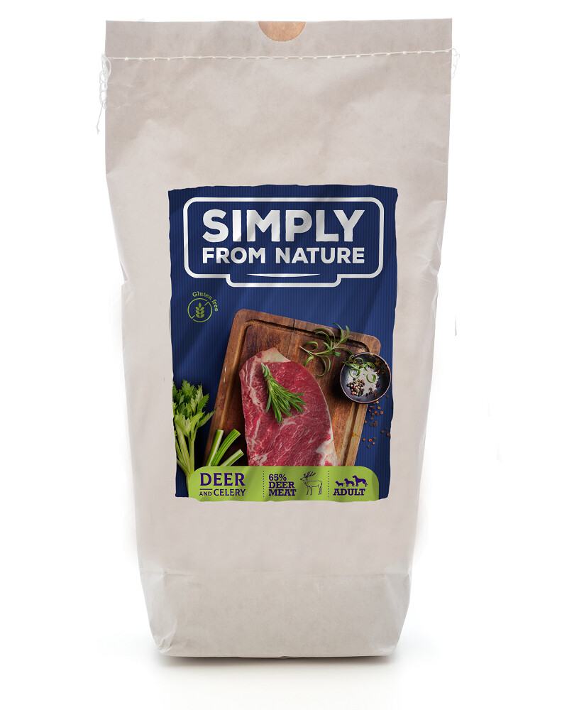 Viande de cerf fraîche (viande musculaire) 42%, viande de cerf séchée (viande musculaire) 23%, céleri séché 12%, betterave rouge séchée 6%, persil, potiron séché et moulu, œufs en poudre, pommes, poires, carottes, romarin, huile de lin, extrait de yucca de Schidiger, fenouil, pulpe de betterave 2%, germe de riz, graines de chardon moulues 1%.