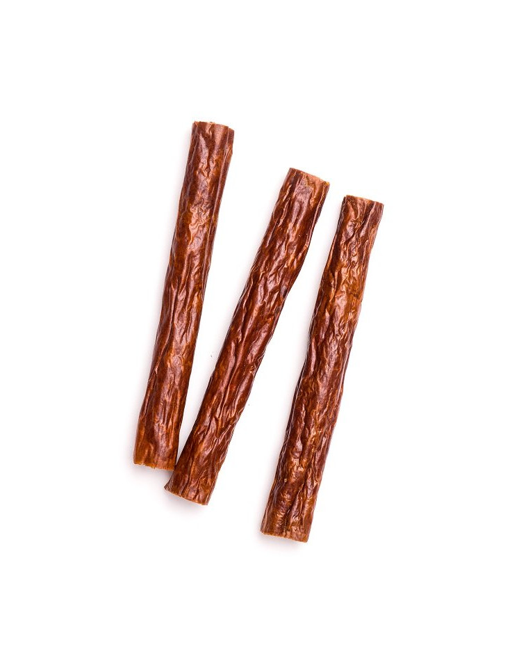 Le processus de séchage, c'est-à-dire l'évaporation de l'eau du produit, garantit la condensation des nutriments. Les bâtonnets peuvent être servis entiers, ils constituent une excellente variété au régime alimentaire du chien et une friandise saine. En même temps, ils peuvent être facilement divisés en plus petits morceaux et utilisés pour remplir des jouets ou un tapis de reniflage ou comme friandises d'entraînement. La texture de la viande grossièrement hachée et séchée est particulièrement savoureuse et intéressante pour les chiens.