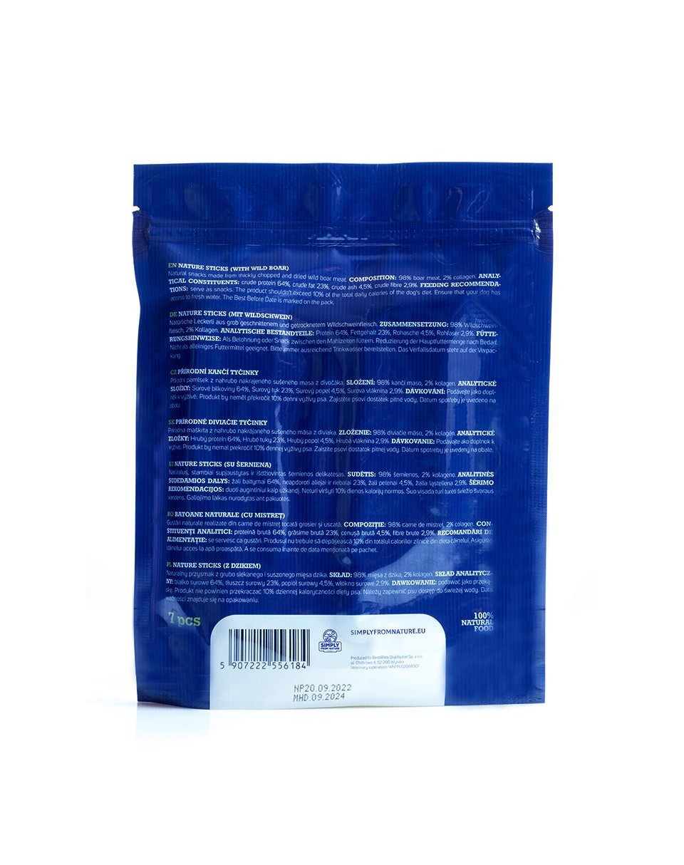 Composée de 98 % de viande de sanglier enveloppée dans une enveloppe de collagène. La taille du bâtonnet individuel a été adaptée à la capacité de la mâchoire des chiens de petites à grandes races.