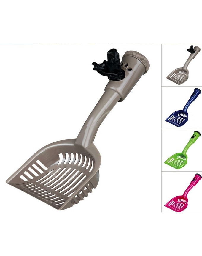 Pelle pour bac à litière, avec sac pour déchets dans la poignée (20 sacs inclus). Taille M, 38 cm. Couleurs assorties, couleur envoyée au hasard.