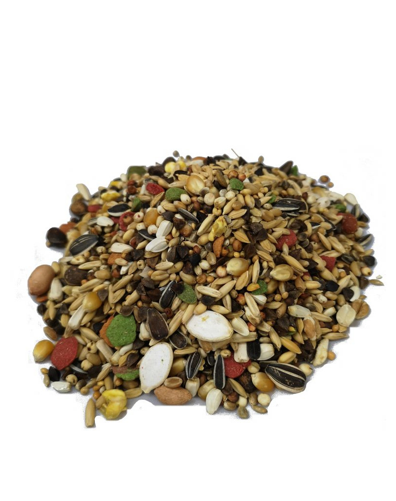 COMPOSITIONavoine, froment, sarrasin, riz paddy, maïs, tournesol strié, milo, dari, alpiste, pépins de courge, millet blanc, cardy, tournesol blanc, arachides pelées, noix de cèdre, millet jaune, froment soufflé, maïs soufflé, baie d’églantier, piments rouges, granulés maxi V.A.M., écailles d’huîtres