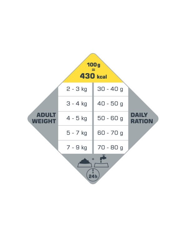 protéines 40,0% (*90,0% de protéines d'origine animale), matières grasses 20,0%, cendres brutes 9%, fibres brutes 2,5%, calcium 1,2%, phosphore 1,0%, taurine 3300 mg/kg.