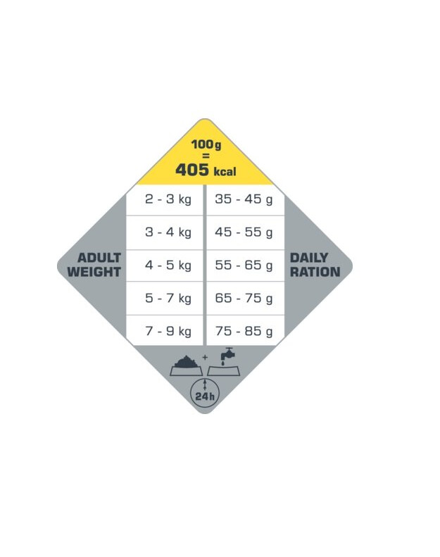 protéines 38,0% (*87,0% de protéines d'origine animale), matières grasses 17,0%, cendres brutes 7,5%, fibres brutes 5,0%, calcium 1,2%, phosphore 1,0%, taurine 4300 mg/kg