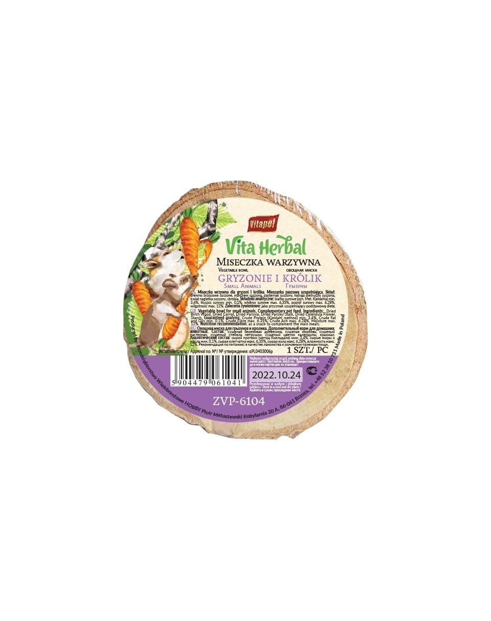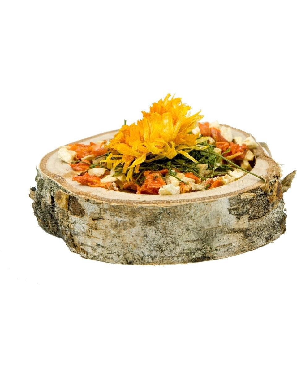 Bol de légumes en bouleau pour rongeurs et lapins contenant un complément alimentaire pour ajouter de la variété au menu quotidien. Les légumes contenus dans le mélange sont une source de vitamines et de minéraux qui ont un effet bénéfique sur la condition de l'animal.